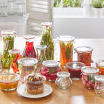 Les bocaux, résistants aux chocs et aux rayures, sont munis d'un couvercle en verre, d'un anneau d'étanchéité en caoutchouc et de 2 pinces. Vont au four jusqu'à 200 °C, vont au micro-ondes. En option : couvercles de conservation en plastique sans BPA, vont sur tous les bocaux ronds.