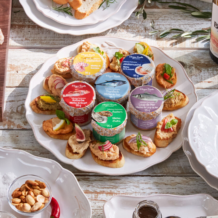 Dans notre atelier, nous allions le rouget frais de Méditerranée, la chair noble de coquille Saint-Jacques et la délicate rascasse avec les meilleurs ingrédients adaptés pour créer des crèmes de poisson uniques et délicieuses. Nos nouvelles variétés à l'huître, au thon et au loup de mer sont tout aussi raffinées. Elles doivent leur goût exquis à la qualité supérieure des produits frais transformés, à la teneur élevée en poissons et fruits de mer d'au moins 50 % et à la préparation soignée selon des recettes traditionnelles. Du vrai beurre français, du bon vin blanc, du cognac ou du pastis et des fines herbes apportent la finesse qu'il faut. Les savoureuses crèmes de poisson sont excellentes sur de la baguette ou comme crostini sur du pain grillé, accompagnées de fines garnitures. Dans une soupe, elles apportent l'épicé et le crémeux, elles enrichissent les amuse-bouche ou les sauces cocktail et vinaigrettes.