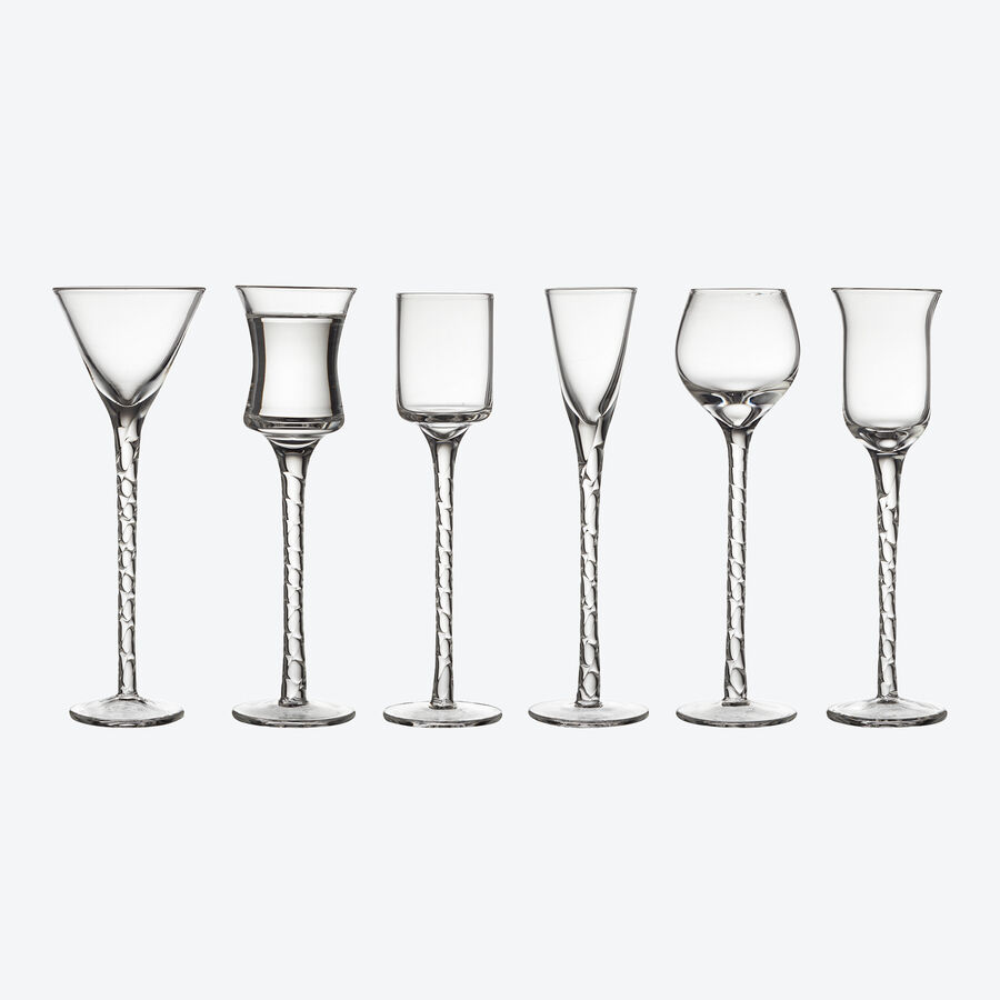 La légèreté et la transparence des longues tiges finement torsadées apportent à cet ensemble de verres un chic hors du commun. La diversité des formes individuelles des calices aux designs différents est particulièrement séduisante.