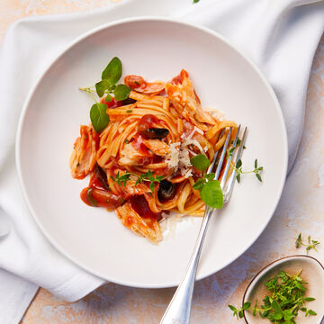 4 Egouttez les linguine cuites al dente dans de l'eau salée et mélangez de suite avec la sauce. Servez avec du parmesan fraichement râpé ou du pecorino.