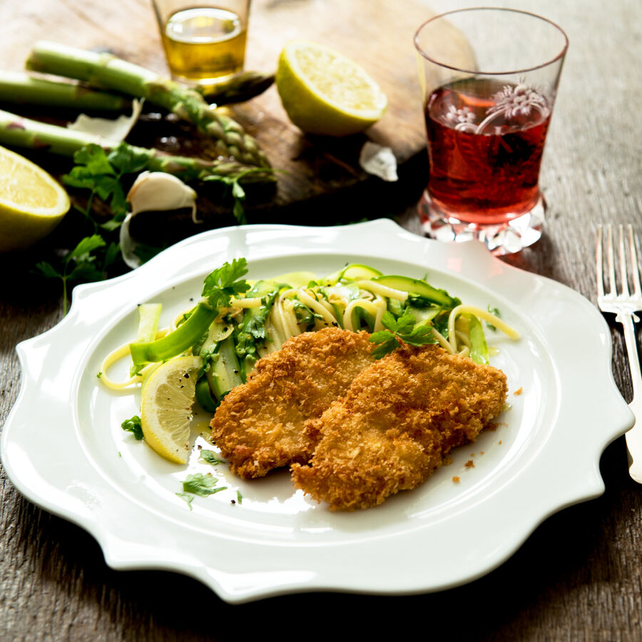Linguine d'asperges vertes avec escalopes de poulet au panko