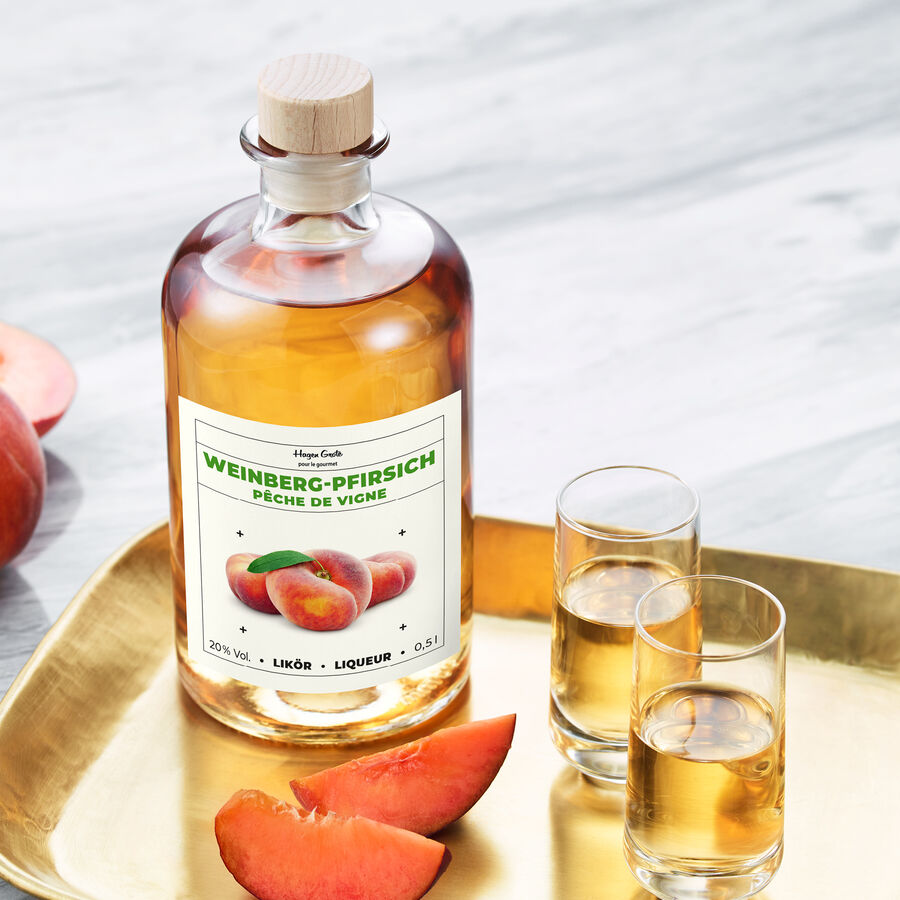 Les pêches de vigne ont un goût beaucoup plus intense que les variétés habituelles. Plantés par les vignerons comme arbres d'ombrage, les pêchers prospèrent sur les bas coteaux de la Vallée de la Moselle. C'est à partir de ces pêches, les plus goûteuses, que nous préparons cette liqueur unique dans notre atelier d'épicerie fine. Pure, frappée, en digestif, ou avec un Prosecco pétillant, c'est un régal fruité unique. Complément idéal de vos desserts, comme lit de sauce aromatique, elle permet une délicieuse présentation raffinée, se marie à merveille aux glaces, aromatise vos salades de fruits frais.