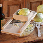 Coupe-choux mandoline avec lames en acier inoxydable et chariot coulissant en hêtre, 55 x 18 cm, poids 2 kg, pilon à choux en hêtre, 60 cm de longueur (piler et presser le chou coupé active la fermentation dans le pot à choucroute), fourchette à chou en hêtre, 30 cm de longueur pour prélever la choucroute, lavage à la main conseillé.