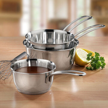 Avec leur forme conique, plus large en haut, les liquides s'évaporeront plus vite que dans des casseroles normales lorsque vous ferez réduire vos sauces. Une graduation précise vous aidera à réduire juste la bonne quantité de liquide. Un fond en sandwich de 6 mm d'épaisseur, avec cour en aluminium encastré, garantit une grande conductibilité thermique et une répartition optimale de la chaleur. Les liquides arriveront à ébullition en quelques minutes. Une répartition parfaitement uniforme de la chaleur et une réaction rapide à tout changement de température contribueront à des résultats impeccables. Ces casseroles fonctionnelles sont aussi belles que robustes. Zones arrondies entre la paroi et le fond, bord verseur tout autour, bec verseur, grands manches résistants au four pour une manipulation sûre, pour tous les types de feux, y compris à induction, acier inoxydable 18/10, petit format Ø 12 cm, hauteur 7 cm, graduation 150-500 ml, moyen format Ø 14 cm, hauteur 8,2 cm, graduation 200-700 ml, grand format Ø 16 cm, hauteur 8 cm, graduation 250-1.000 ml, vont au lave-vaisselle.