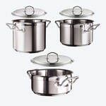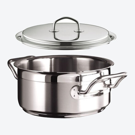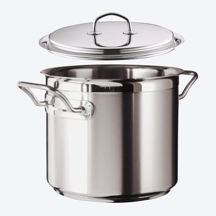 Acier inoxydable, fond multicouche de 8,8 mm, noyau en aluminium de 6 mm, bord verseur, poignées isolantes, résiste au four jusqu'à 250 °C, passe au lave-vaisselle. Pour tous les types de cuisinières, y compris l'induction.
