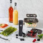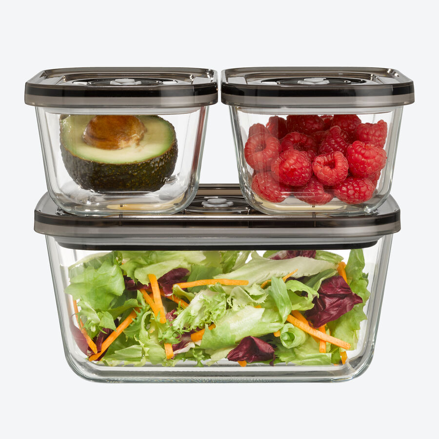 Une fois l'air retiré, vous conservez les aliments jusqu'à 8 fois plus longtemps dans ces boîtes de conservation en verre dur borosilicaté de haute qualité avec des couvercles en plastique dur (sans BPA). Le goût, les arômes délicats, les vitamines et les nutriments précieux sont préservés. Elles conviennent à merveille à la conservation des fruits ou légumes fragiles, de la charcuterie, du fromage ou des aliments cuits. Les récipients (sans couvercle) supportent des températures au four jusqu'à 350 °C pendant 1 heure (les couvercles jusqu'à 100 °C), passent au micro-ondes sans couvercle, empilables, passent au lave-vaisselle, lavage à la main recommandé pour les couvercles.