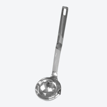 Cette louche convient parfaitement à la séparation des graisses. Placée devant le bec verseur, une cloison munie d'une petite ouverture permet à la couche de graisse de stagner dans le haut de la louche, tandis que le liquide pauvre en graisse s'écoule par le bas. Vous obtenez ainsi rapidement, sûrement et proprement des sauces, soupes et fonds dégraissés.