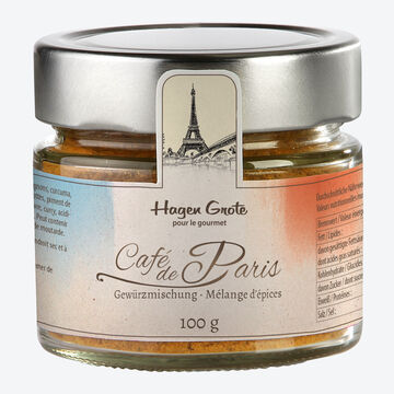 En 1930, Monsieur Boubier créa dans son restaurant genevois, « le coq d'or », un beurre aux épices dont le succès ne se fit pas attendre. Il transmit ensuite sa recette gardée secrète à son beau-fils, propriétaire du restaurant « Café de Paris » : le mélange d'épices du même nom était né. Son goût délicat et unique a immédiatement séduit et est aujourd'hui encore mondialement très prisé. Ce mélange d'épices « Café de Paris » exclusif et original a été élaboré dans notre atelier d'épicerie fine. Le curcuma, le poivre, le piment et bien d'autres épices assurent un arôme intense. Enchantez vos invités avec le fameux beurre ou la sauce « Café de Paris » qui vous réussiront très facilement avec ce mélange. Est excellent également pour épicer le poisson, les fruits de mer, la viande ou les gratins. Livré avec 2 recettes.