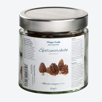 L'arôme et le goût des champignons séchés sont plus prononcés que ceux des champignons frais. Seuls les plus belles morilles domestiques sont sélectionnées pour nous, cueillies à la main et mises en bocaux sous forme de têtes entières. La morille conique est devenue le champignon local comestible le plus cher, indispensable dans la cuisine haut de gamme et un produit fin rare pour les gourmets du monde entier. Faites tremper les morilles séchées dans de l'eau chaude pendant environ 3 heures, puis procédez comme d'habitude. Ne jetez pas l'eau de trempage, elle peut être utilisée pour la cuisson. Par personne, compter 10 à 15 g de cèpes séchés, pour obtenir 100 à 150 g après réhydratation (par trempage).