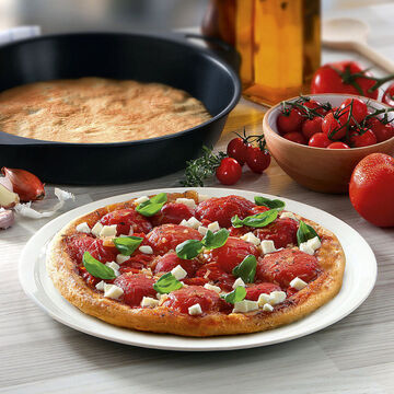 Aluminium comprimé, anodisé dur (deux fois plus dur que l'acier inoxydable), excellentes qualité de conductibilité thermique, revêtement anti-adhérent en platine-Teflon® triple résistant, Ø 28 cm, Ø 35 cm avec les poignées, 5,5 cm de hauteur, passe au four jusqu'à 250 °C, bord moulé avec poignées intégrées, repose à plat pour le démoulage, adapté à l'induction, passe au lave-vaisselle (lavage à la main recommandé pour une longue conservation du revêtement anti adhérent).