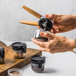 Doté d'un mécanisme en céramique d'une extrême précision, inoxydable et durable, ce moulin permet un réglage du grain en six étapes, allant d'une mouture très fine à plus grossière - idéal pour toutes vos épices, graines et mélanges. Grâce à son ingénieux système, il peut s'utiliser aussi bien d'une main pour un usage rapide, que des deux mains pour un effort doublé. Il suffit de presser les poignées ergonomiques d'une seule main ou, pour une mouture plus soutenue, de les ouvrir avec les deux mains. Le récipient en verre (réf. 275S02), facilement interchangeable, vous permet de passer aisément d'une épice à l'autre. Réalisé en verre borosilicate de haute qualité, il est parfaitement stable et transparent pour un contrôle visuel du contenu à tout moment. Sa large ouverture facilite le remplissage. Le design cylindrique légèrement incliné, associé à une bordure anti-miettes intégrée, maintient votre plan de travail propre et sans résidus.
