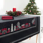 Ce merveilleux paysage hivernal a été conçu par la styliste suédoise Veronica Seipel. Les maisons en bois rouge, aux fenêtres blanches, endormies dans la neige sous les arbres sont typiques du paysage suédois. Le fond sombre met particulièrement en valeur le dessin habile. La technique de tissage jacquard brevetée par les ateliers de tissage Ekelund, l'entreprise familiale la plus vieille du monde, permet la représentation de charmants détails sur un tissu de belle épaisseur. La Maison royale de Suède, mais aussi le Kremlin et l'empereur Akihito du Japon, font confiance à l'art artisanal de cette manufacture renommée. Fils coton 100 % bio, 320 g/m² (serviettes, sets de table, chemins de table 280 g/m²), lavage en machine à 60 °C.