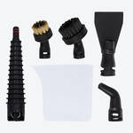 Tube en acier, plastique, 31 x 16 x 124 cm avec poignée déployée (l/p/h), réservoir d'eau 0,35 l, 230V/1.300W, câble de 5 m, enroulement du câble, livré avec 2 pads de nettoyage Ø 16,5 cm, cycle délicat 30 °C, brosse ronde en plastique, buse d'angle, racloir, buse jet, brosse métallique, gobelet doseur.