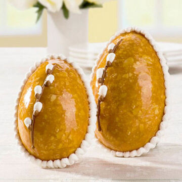 Rare chef d'oeuvre de confiserie, cet oeuf en nougatine est entièrement réalisé à la main. Du sucre fondu, des amandes râpées, du beurre de cacao et rien d'autre! Il ne peut être réalisable qu'à la main ce qui en fait sa spécificité. Nous avons confié la fabrication de ces oeufs en nougatine, à notre confiseur d' Uhingen en Souabe, qui les produit avec un grand savoir faire artisanal. Ils sont enrobés d'une fine couche de beurre de cacao pour les préserver de l'humidité. Les branches de saule, décor traditionnel en meringue, sont appliquées une par une avec beaucoup de soin.