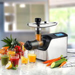 Vous choisissez parmi les 6 programmes automatiques le niveau de vitesse optimal pour hacher la viande fraîche ou surgelée, le poisson, l'extraction de jus ainsi que la fonction râpe multiple. L'appareil robuste, avec ses 220 tours/minute travaille jusqu'à 35 kg de viande par heure. La touche marche arrière réglable fait ses preuves avec les cartilages et les tendons de la viande ainsi que pour le nettoyage de restes de fibres. Les accessoires en option transforment le hachoir à viande puissant en une centrifugeuse à froid (accessoire Slow-Juicer) ainsi qu'en une râpe multi-usage avec trois tambours interchangeables pour couper, râper fin et gros.