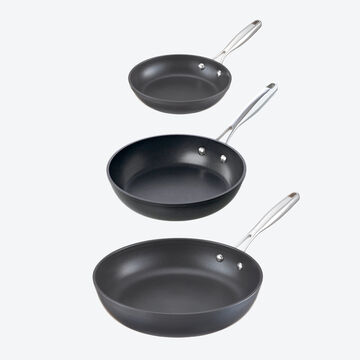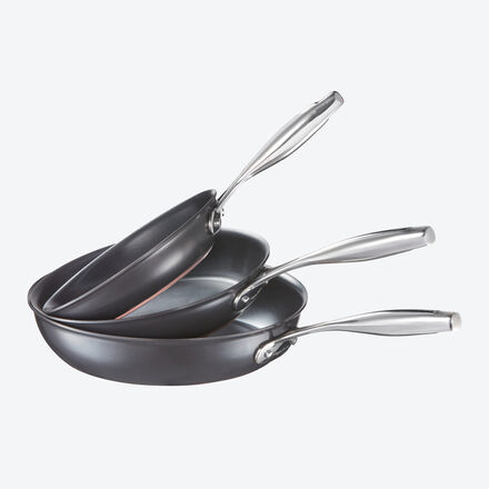 Lot de 3 poêles (Ø 20, 24, 28 cm), adaptées à tous les feux, passent au four jusqu'à 250 °C, lavage à la main recommandé pour une longue conservation du revêtement antiadhésif.
