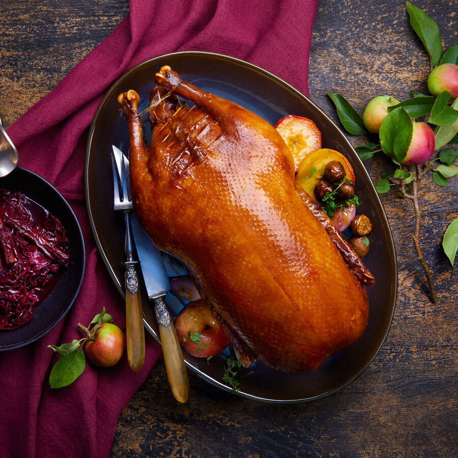 L'oie rôtie s'accompagne très bien de chou rouge. Mélanger 800 g de chou rouge en boîte égoutté avec des oignons hachés revenus dans 100 g de graisse d'oie avec du sel, une cuillère à café de sucre, 25 cl de vin rouge, 1 jus de citron, des clous de girofle, du laurier et quatre pommes Boskoop coupées en quatre. Laisser mijoter à feu doux et assaisonner de sel et de poivre.