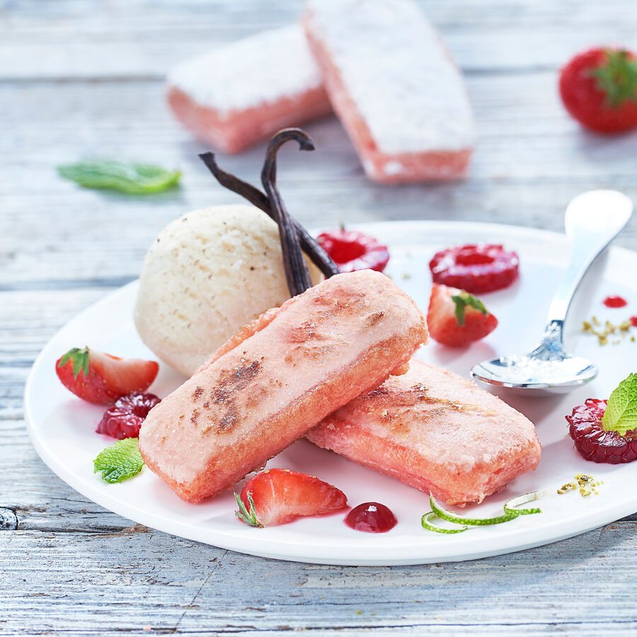 Disposer 3 pains perdus sur chaque assiette à dessert avec une boule de glace à la vanille ou à la framboise, décorer de framboises et de feuilles de menthe.