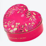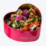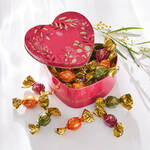 Selon une recette traditionnelle, les cubes de pâtes de fruits moelleuses sont fabriqués à partir de purées très concentrées de fruits mûris au soleil et de pur jus de fruits. D'une douceur incomparable, ils fondent dans la bouche. Les trois délicieuses saveurs de griotte, d'orange et de gingembre sont fabriquées en petits lots afin de garantir la fraîcheur, le goût prononcé et le moelleux particulier. Les petits cubes sont enrobés de chocolat noir très fin (min. 70 % de cacao). Livrés dans une boîte métallique décorative en forme de coeur.