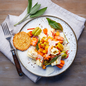 • Image du produit pour 'Pâtes fantaisie citrouille avec cubes de potimarron, beurre à la sauge et crackers au parmesan'