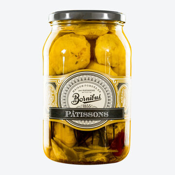 Découvrez une spécialité originale : ces petits pâtissons séduisent par leur forme insolite en soucoupe et leur texture fondante, relevée d'un goût délicatement doux. Cueillis à pleine maturité, ils sont immédiatement mis en bocal dans une préparation artisanale aigre-douce, agrémentée d'aneth, d'oignon et d'ail. La confection a lieu dans une entreprise familiale fondée en 1861, où une partie du travail est encore effectuée à la main avec un grand souci du détail.