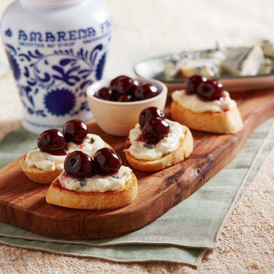 Répartir une cuillère à café de crème au gorgonzola sur chaque bruschetta, garnir de quelques morceaux de cerises amarena et arroser d'un peu de sirop.