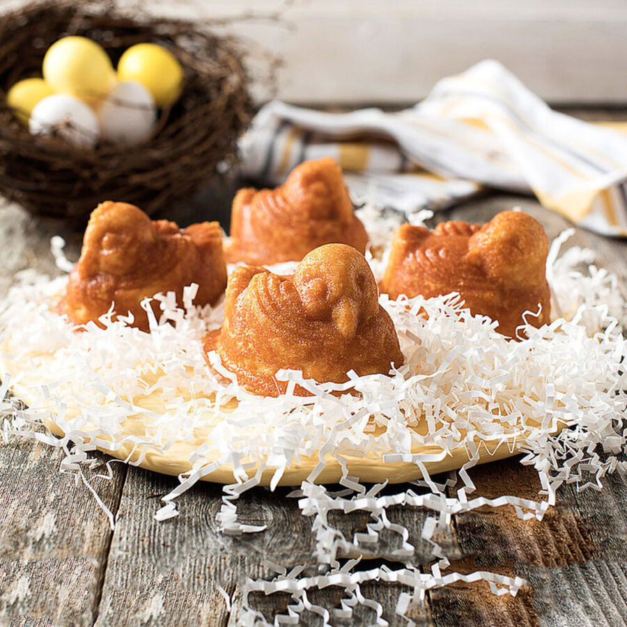 2 Répartir uniformément la pâte dans 6 petits moules. Frapper doucement les moules sur le support pour éliminer les bulles d'air éventuelles dans la pâte. Cuire 22-28 minutes. Tester la cuisson avec un thermomètre de cuisson ou un bâtonnet de bois. Les petits gâteaux doivent être complétement cuits. Retirer du four et laisser refroidir 5-10 minutes. Démouler sur une grille et laisser entièrement refroidir. Décorer à votre gré.