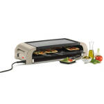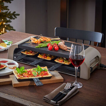 Corps en acier inoxydable et plastique, 58 x 23 x 12 cm (l/p/h), chaleur supérieure réglable en continu, interrupteur indépendant pour la chaleur inférieure, poids 5 kg, 230V/1. 450W, câble de raccordement de 1,5 m, coupe-pizza, 8 poêlons à pizza/raclette, pour 8 personnes.