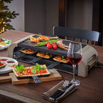 Placer la pâte à pizza découpée dans les poêlons et cuire selon les préférences de 5 à 7 minutes, avec la chaleur supérieure et inférieure jusqu'à ce qu'elle soit croustillante. Peut également être utilisée seulement en raclette avec la chaleur du dessus. D'autres ingrédients peuvent être cuits sur la plaque supérieure du gril en fonte d'aluminium de 40 x 22 cm. Un compartiment de rangement en acier inoxydable, pour les poêlons, est situé sous l'espace de cuisson central.