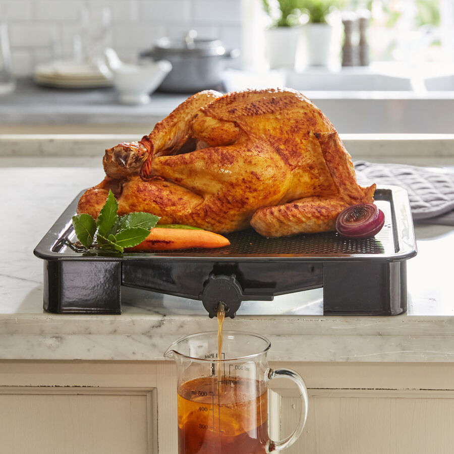 Qu'il s'agisse d'un rôti avec du chou rouge ou de plats de poisson légers avec des légumes cuits à la vapeur, savourez vos plats au four avec 3 fois plus de sauce que dans les rôtissoires traditionnelles. Le jus de cuisson qui s'écoule ou le liquide préalablement rempli pour la cuisson à la vapeur trouvent leur place dans le récipient collecteur d'une capacité de 3 l. La perforation spéciale de la plaque de rôtissage empêche l'évaporation et garantit une grande production de liquide pour une délicieuse base de sauce. Le robinet permet un retrait facile. Ainsi, les aliments à rôtir peuvent également être arrosés confortablement dans le four. Sur la grande surface de cuisson, vous cuirez 2 poulets entiers ou une grande oie. Aromatisez les plats en les remplissant de bouillon de légumes ou de viande, de vin ou de bière. La surface émaillée de la rôtissoire universelle/plaque à rôtir est résistante aux coupures et aux rayures, rendant possible la découpe des aliments directement sur la plaque.