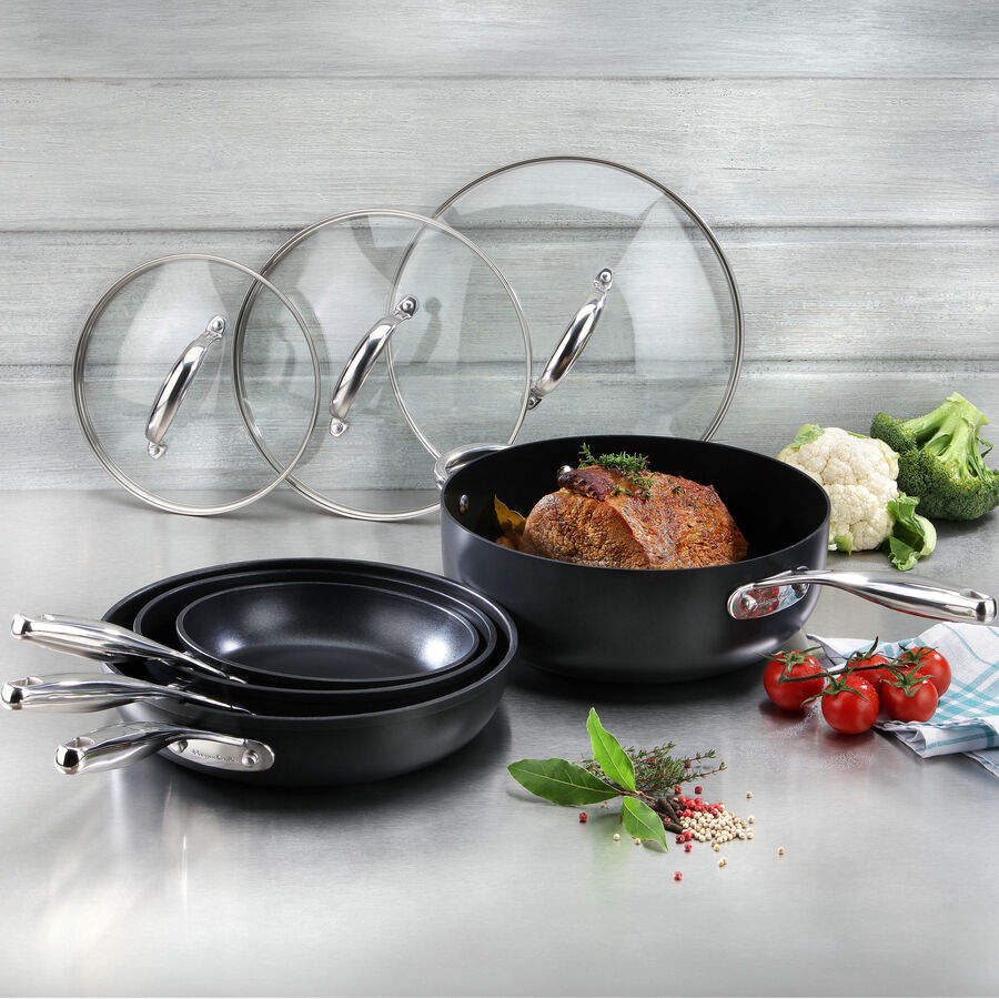 Ces poêles sont fabriquées selon les hauts standards avec l'exigence d'une grande fonctionnalité en cuisine. Elles sont fabriquées à partir d'un aluminium comprimé aux propriétés de conductivité thermique excellentes. Dans un procédé compliqué par anodisation dure, la structure moléculaire est grandement renforcée. Le résultat, les poêles sont deux fois plus solides que l'acier inoxydable. Le fond en acier inoxydable-aluminium de 4 mm d'épaisseur, compatible avec l'induction, se prolonge sans transition sur les côtés plus fins. Le bord supérieur renforcé assure la plus haute solidité. Le revêtement anti adhérent en platine-Teflon® durable 3 couches d'une qualité haut-de-gamme est lié de façon indissociable à la poêle. Les manches creux en acier inoxydable de forme ergonomique et professionnelle sont anti-chaleur. Nos poêles ont plus que fait leurs preuves lors de tests de longue durée dans la gastronomie. Livrée avec recettes. Adaptée à tous les feux, passent au four jusqu'à 250 °C, lavage à la main recommandé pour une longue conservation du revêtement antiadhésif.