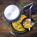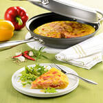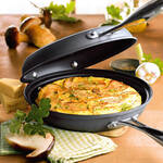 Poêle réversible pour cuire parfaitement, sur les deux faces, omelettes, frittatas, tortillas et crêpes. La poêle du dessus et celle dessous sont des poêles individuelles qui présentent toutes les qualités requises. Attachées l'une à l'autre, elles deviennent une poêle réversible. Vous retournerez en toute sécurité n'importe quel contenu, des omelettes semi-liquides aux frittatas en cours de cuisson. Vous contrôlerez ainsi à tout moment le niveau de cuisson et de brunissage. Grâce au revêtement Teflon® Platinum durable de très grande qualité, rien n'attache. L'aluminium anodisé, d'une épaisseur constante de 2,5 à 3 mm du fond jusqu'au bord, est très conducteur. L'optimisation de la structure moléculaire rend les poêles deux fois plus dures que l'acier inoxydable. Leurs fonds en acier inoxydable aimanté de 2 mm d'épaisseur, aplanis à la meule, permettent d'utiliser les poêles avec l'induction et améliorent la répartition uniforme de la chaleur. Les manches creux en acier inoxydable fermement rivetés restent toujours froids. Avec son poids minime d'environ 1 kg (env. 2 kg ensemble) le maniement est sûr et aisé lors du changement de côté. Poêles réversibles, Ø 24 cm (fond Ø 19,5 cm), hauteur 4 et 5 cm. Pour tous les types de cuisinières, y compris à induction. Résistent au four jusqu'à 250 °C, lavage à la main recommandé pour une longue conservation du revêtement antiadhésif.