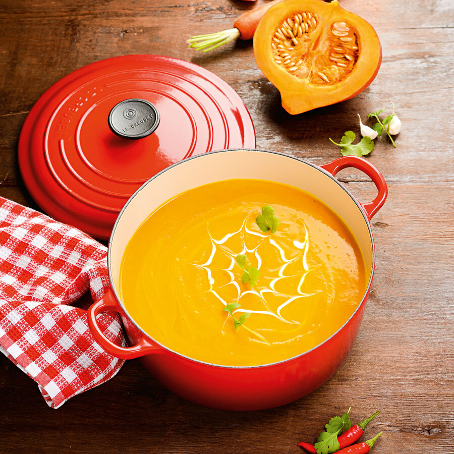 3 Incorporer la crème fraîche et la pâte de curry avec le fouet, puis laisser mijoter pendant 5 minutes. Assaisonner avec le sel et le poivre. Mouliner le potage et le passer au tamis fin.