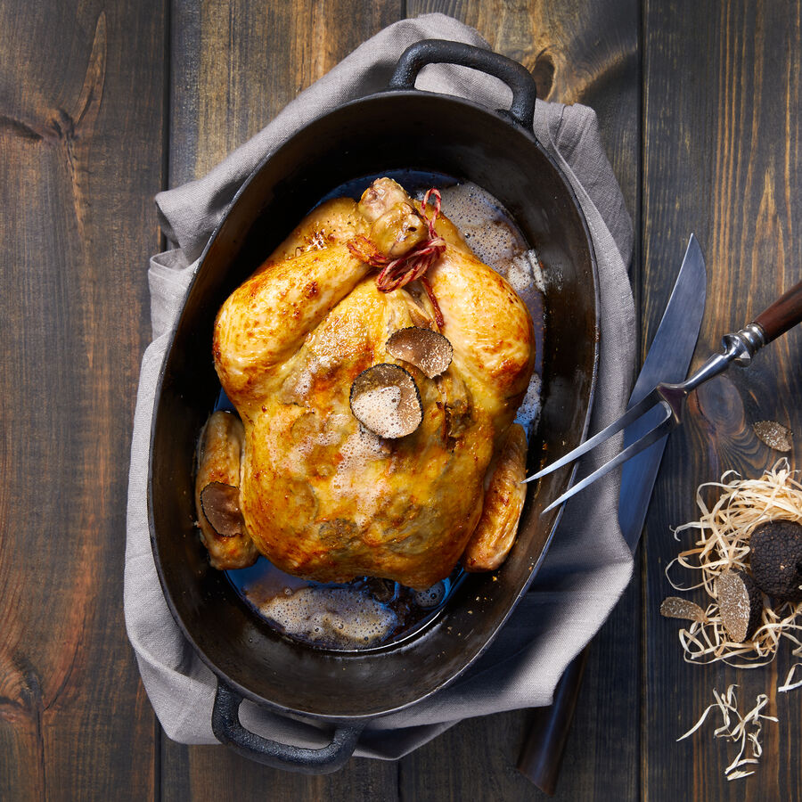 1 Laver le poulet et le sécher. Introduire des petites tranches fines de truffes entre la peau et la chair. Lier les cuisses avec de la ficelle de cuisine. Assaisonner le poulet à l'intérieur et l'extérieur avec un mélange de sel et de poivre fraîchement moulu.