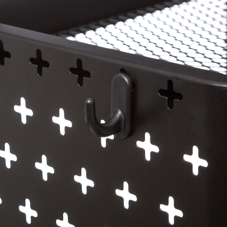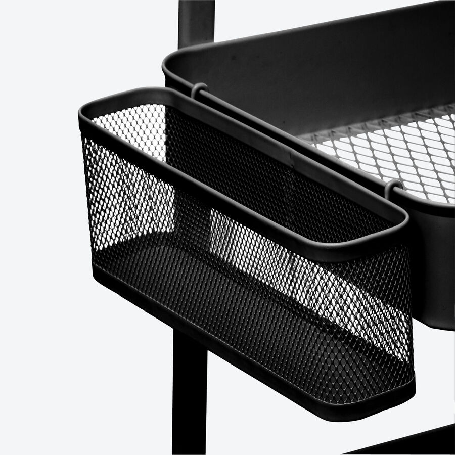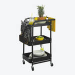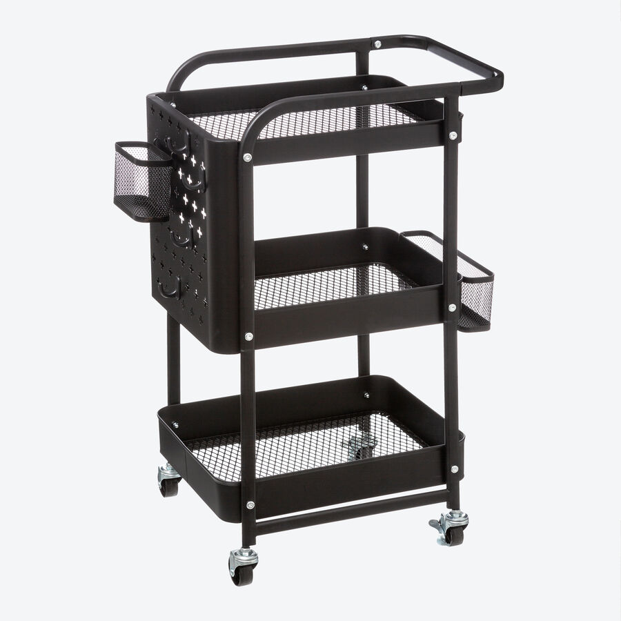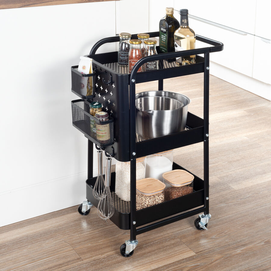 Grâce à ses roulettes, ce chariot en métal noir peut être déplacé rapidement partout dans la maison. Sa taille compacte lui permet de trouver place dans le moindre recoin ou n'importe où sans être gênant. Son design classique s'intègre dans presque toutes les cuisines, salons ou bureaux. 3 niveaux, complétés par 2 corbeilles et 5 crochets, offrent un espace de rangement suffisant. Pour nettoyer, essuyer simplement avec un chiffon humide.