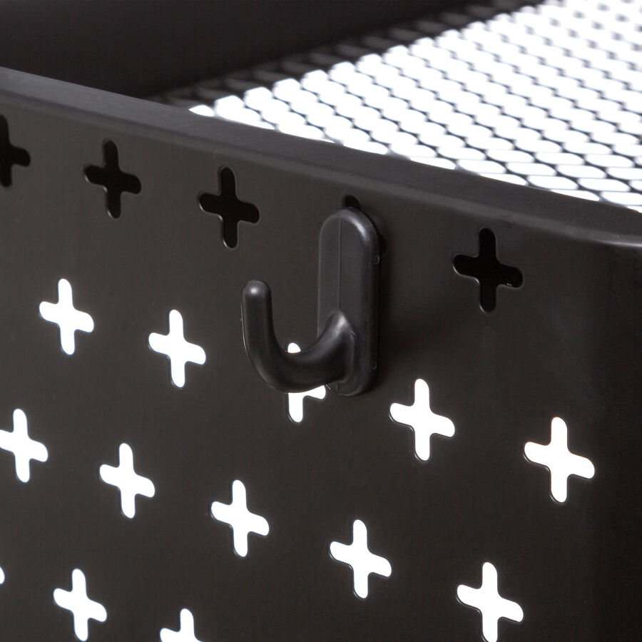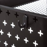 Métal laqué noir, crochets en plastique, 51 x 29,5 x 76 cm (l/p/h), montage simple à prévoir (notice et outils fournis).