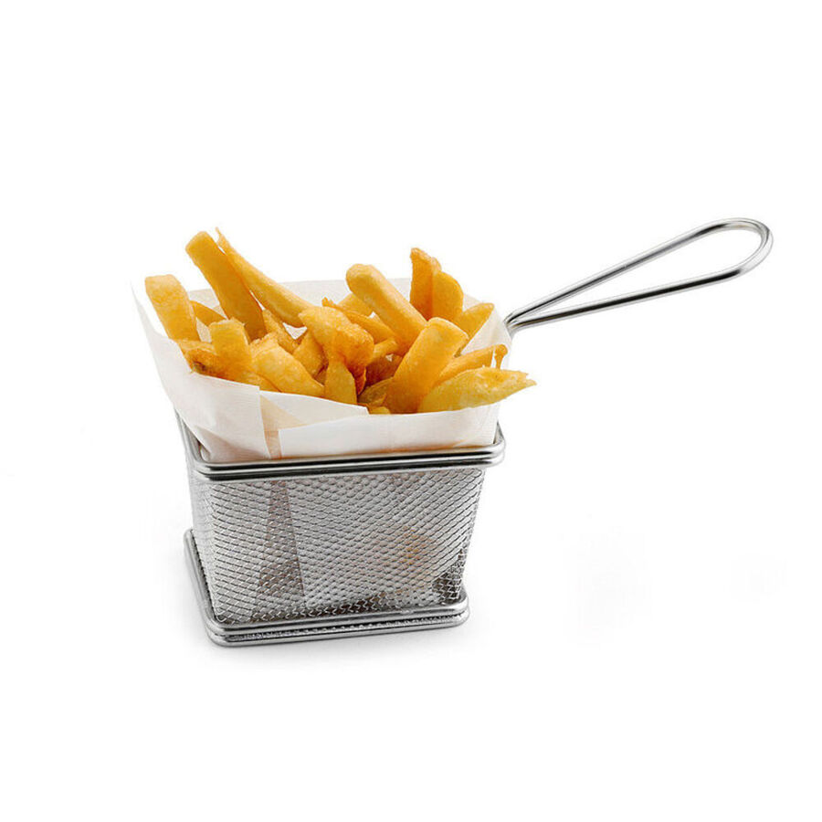Coupées à la main, les frites fraîches, sont l'accompagnement authentique des steaks et des spécialités de hamburgers de qualité gourmet. Dans ces petites corbeilles en acier inoxydable vous servez les tranches de pommes de terre mais aussi les légumes ou les fruits de mer frits, « urban style ». Recouverts de papier sulfurisé ou de cuisson, les petits paniers restent propres et la table aussi.