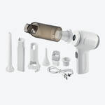 Plastique, 20,5 x 16,5 x 5 cm (l/p/h), batterie Lithium-ion, filtre HEPA, 7,4V/60W, grande puissance d'aspiration, livré avec 4 embouts pour aspirer, souffler, mettre sous-vide, avec câble de recharge.