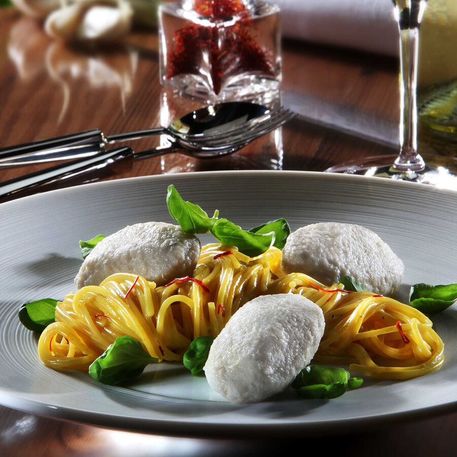 Quenelles de poisson dans une sauce au safran avec des Spaghettini