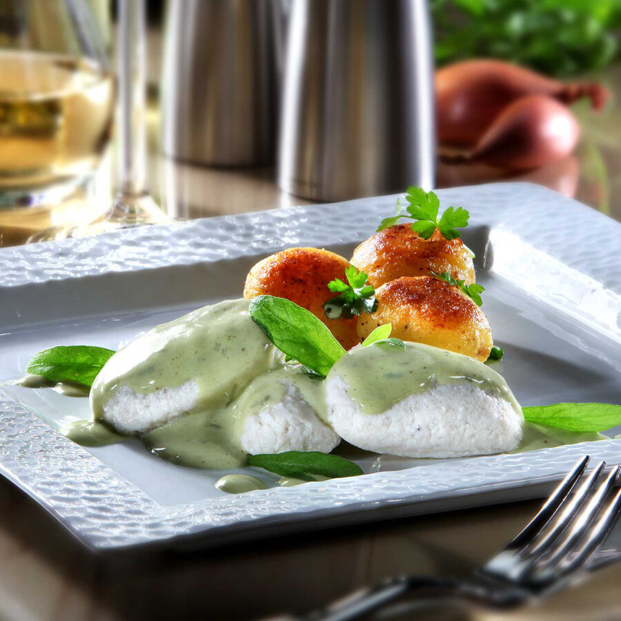 • Image du produit pour 'Quenelles de poisson dans une sauce verte à la moutarde à l´estragon garnies de pommes de terre rissolées'