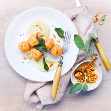 Quenelles de saumon sur purée de céleri avec sauge frite et pignons de pin