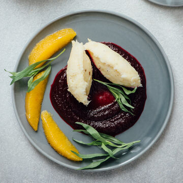 Quenelles de skrei sur une purée de betteraves rouges et d'oranges