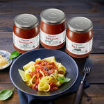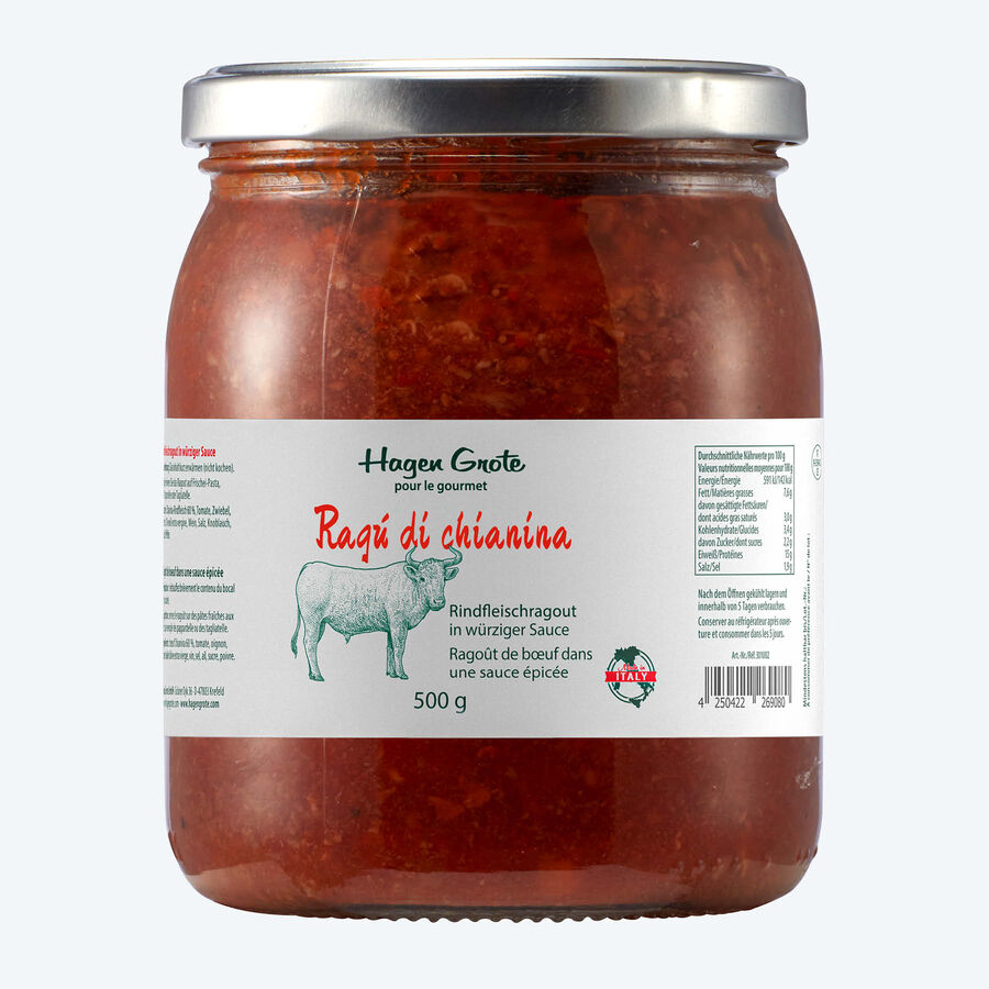 En automne et en hiver, le ragú di chianina, ragoût de boeuf dans une sauce épicée, avec les pâtes extra-larges, les pappardelle, est un classique de la cuisine italienne. La race chianina toscane est la race bovine la plus grande et la plus ancienne du monde. Elle se caractérise par une viande particulièrement tendre et juteuse, au fin persillage. Dans notre petite manufacture italienne, nous faisons mariner la viande de boeuf fraîchement prélevée dans des légumes et du vin pendant 12 heures selon une recette traditionnelle. Une fois la viande revenue, on ajoute des légumes, des tomates de la région et des épices comme le romarin et la sauge. Raffiné avec des olives noires et un peu de cacao, on le laisse mijoter plusieurs heures pour en faire un délicieux ragoût. « La perla del gusto » pour les Italiens.