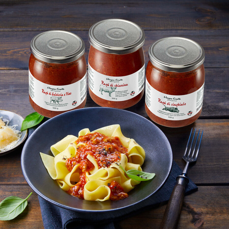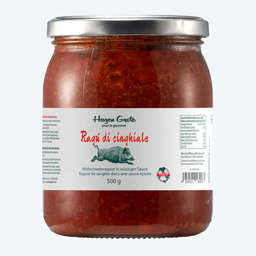 En automne et en hiver, le ragoût de sanglier dans une sauce épicée, le sugo di cinghiale, avec les nouilles extra larges en ruban, les pappardelle, est un classique de la cuisine régionale. Dans notre petite manufacture italienne, nous faisons mariner la viande de sanglier fraîchement prélevée dans des légumes et du vin pendant 12 heures selon une recette traditionnelle. La viande de haute qualité est extrêmement aromatique, sans le goût prononcé de gibier. Une fois la viande revenue, on ajoute des légumes, des tomates de la région et des épices comme le romarin et la sauge. Raffiné avec des olives noires et un peu de cacao, on le laisse mijoter plusieurs heures pour en faire un délicieux ragoût. « La perla del gusto » pour les Italiens.
