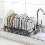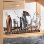 Grâce à 12 arcs métalliques réglables de manière variable, le support métallique extensible permet de ranger poêles, couvercles, planches à découper, moules à pâtisserie, plateaux de différentes tailles. Peut être divisé pour s'adapter aux placards et aux grands tiroirs à partir de 30 cm de profondeur. S'utilise également comme égouttoir.