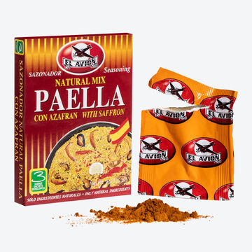 Épices pour la paella contenant du safran et huit autres épices, entre autres curcuma, thym et romarin.