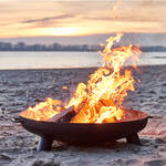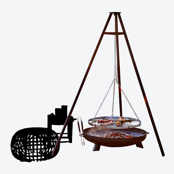 Dans le grand braséro rempli de bois, allumez un feu de camp romantique ou enflammez du charbon de bois. En un rien de temps, le braséro se transforme en parfait barbecue. Le trépied est posé bien sûrement au-dessus des braises. La hauteur idéale de la grille est réglée par poulie.