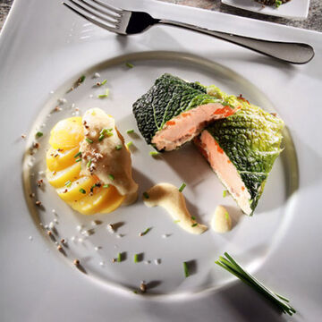• Image du produit pour 'Rouleaux de saumon au chou frisé accompagné de pommes de terre à la ciboulette et de sauce blanche au citron'