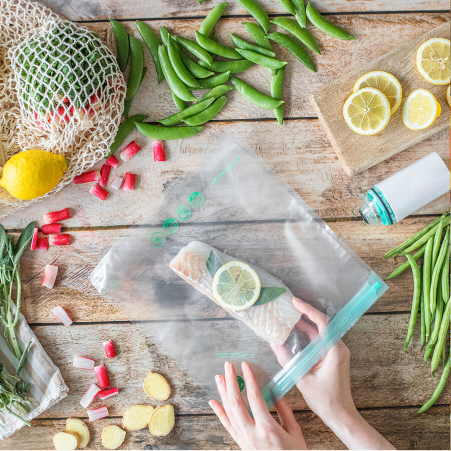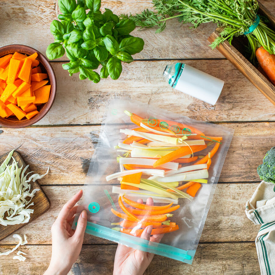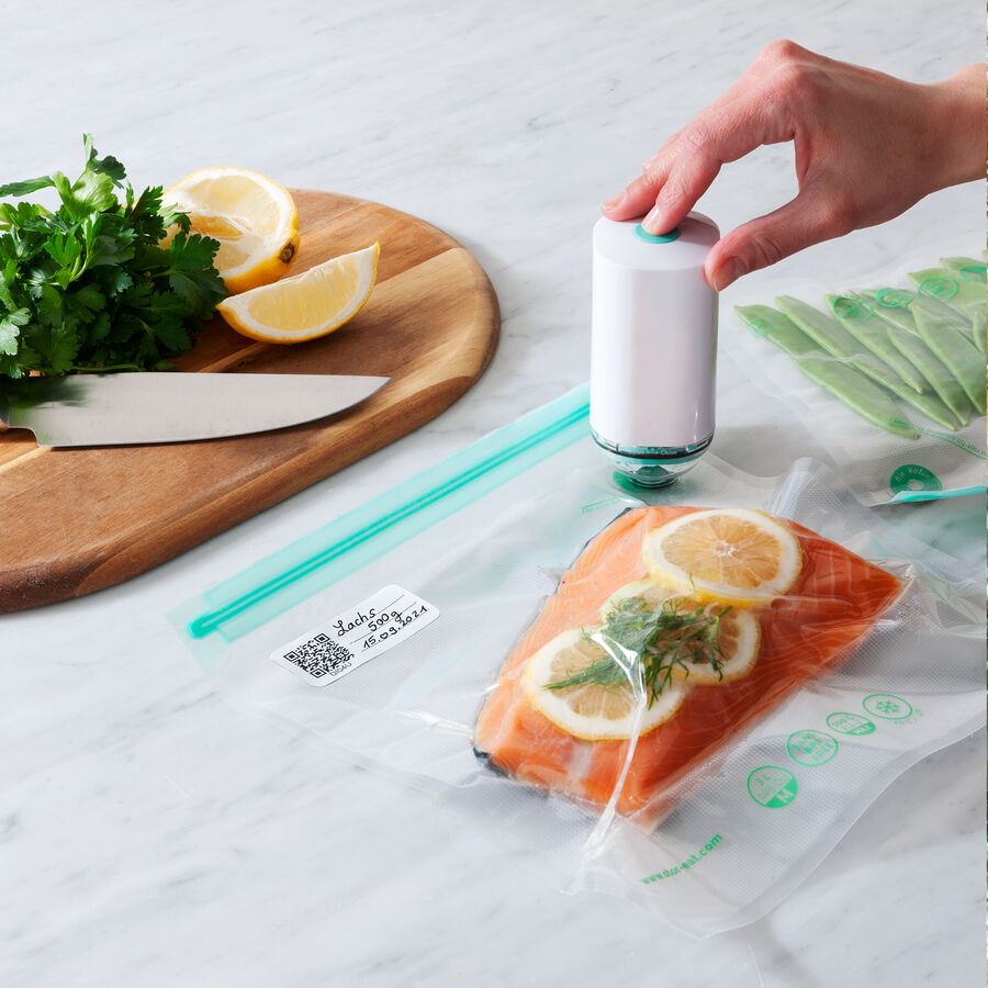 Sacs sous vide de qualité alimentaire avec fermeture à glissière pour une conservation naturelle des aliments. Idéal également pour congeler, mariner facilement ou cuire sous vide. Sans BPA, réutilisable jusqu'à 50 fois, avec des autocollants à code QR pour la gestion des stocks via l'application. Lavage à la main recommandé.