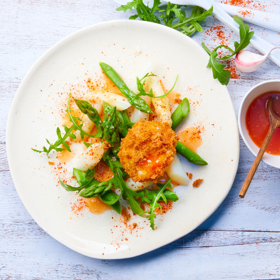 • Image du produit pour 'Salade d'asperges avec oeuf frit et vinaigrette à la pulpe de piment d'Espelette'